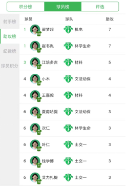 四月的春风化成雨,浸润球场的草皮,带来暖春的气息。林大校园足球联赛正在有条不紊地进行中,每位球员都竭尽全力地为各自球队争夺宝贵的荣誉。积分榜排名第一的是土交一队。射手榜独占鳌头的是来自机电学院的10号马木尔江,个人包揽11枚进球,土交一队的7号加林紧随其后斩下8粒进球。助攻榜头名被机电学院的翟梦超与林学生命联队的崔书胤共同分享。