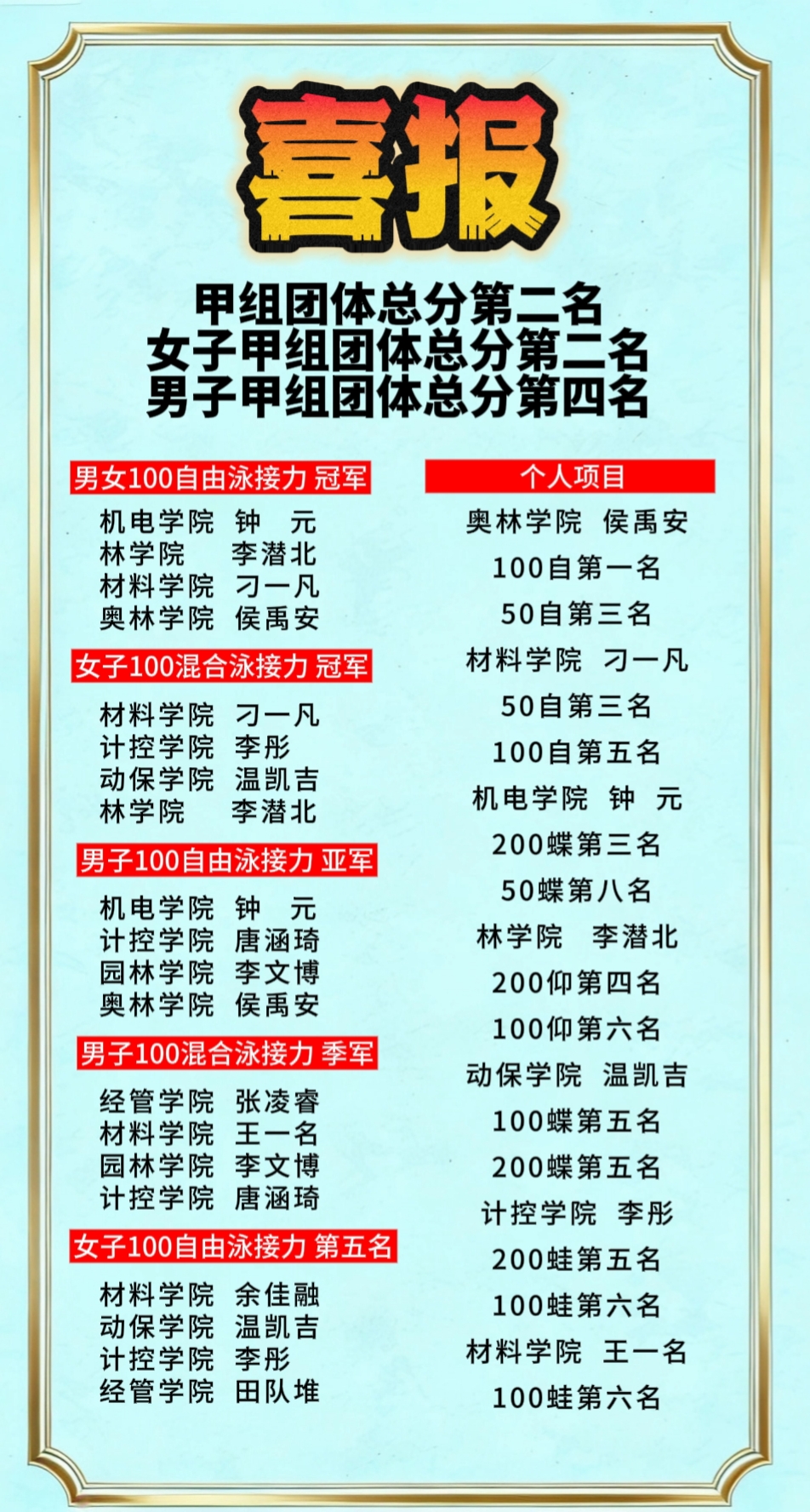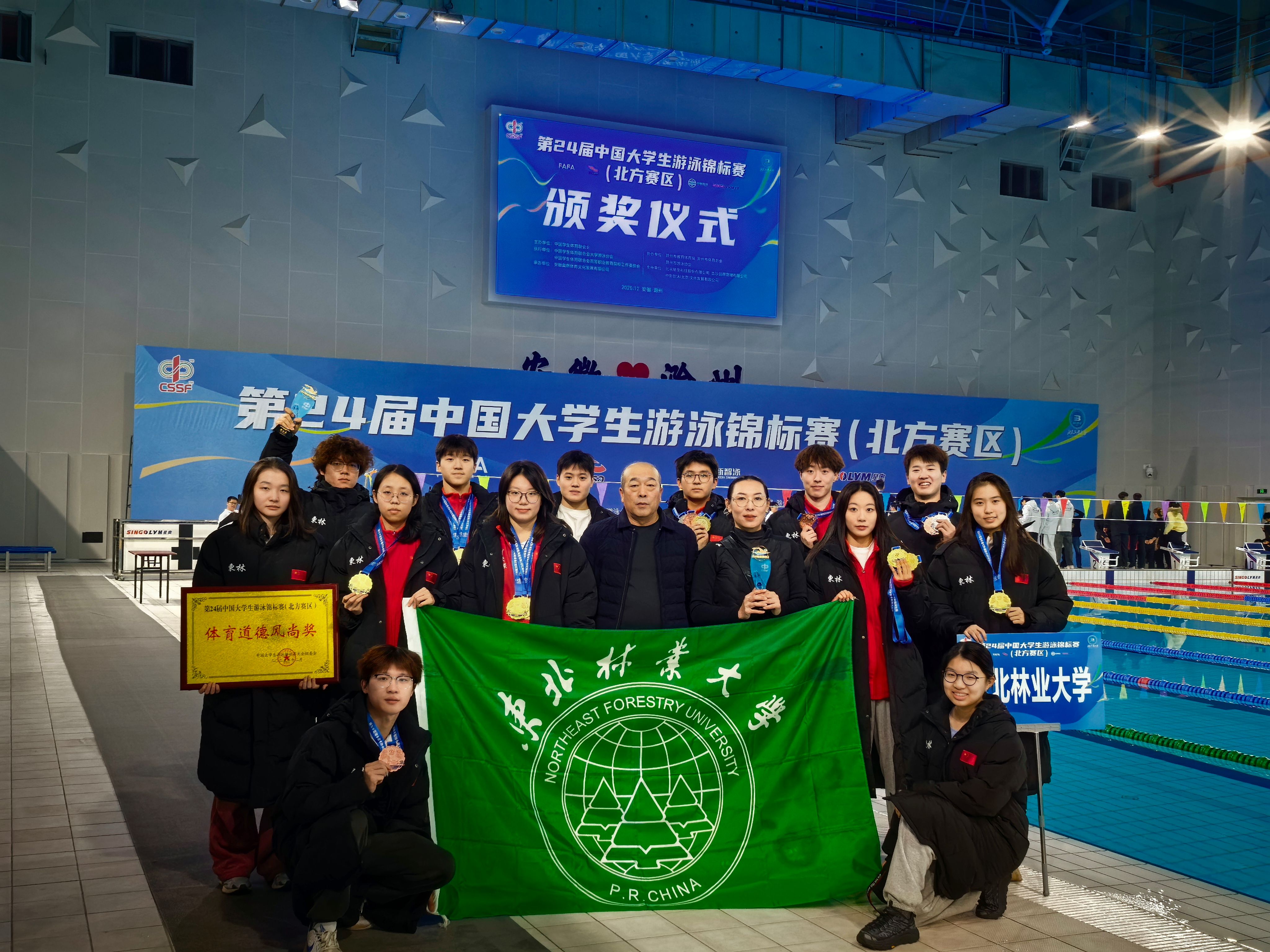 王苏伟、刘丹两位教练指导的13名游泳队队员,均从普通在校学生中选拔产生。他们克服学业压力,坚持利用午休时间进行系统训练,他们以超强自律与毅力实现学训双赢。在赛场上,他们充分彰显了坚韧不拔、团结协作的体育精神与扎实卓越的竞技实力。最终,机电学院钟元、林学院周群琪荣获“优秀运动员”称号,刘丹斩获“优秀教练员”称号,东北林业大学荣获体育道德风尚奖单位。